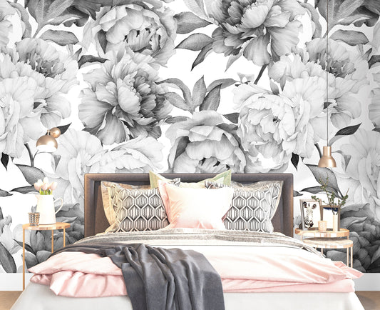 Dark Floral Wallpaper Peel and Stick, Watercolor Peony Wallpaper, Black and White Wallpaper, Removable Wall paper