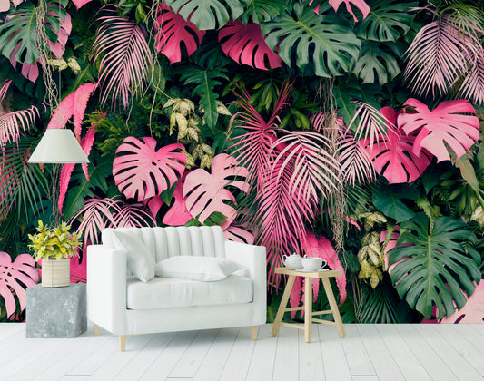 Pink Leaf Wallpaper Peel and Stick, Exotic Wallpaper, Colorful Wallpaper, Tropical Wallpaper, Removable Wall Paper