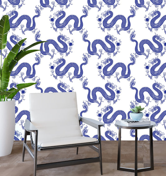 Chinoiserie Wallpaper Peel and Stick, Blue Dragon Removable Wall Paper
