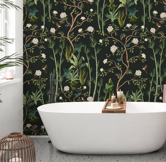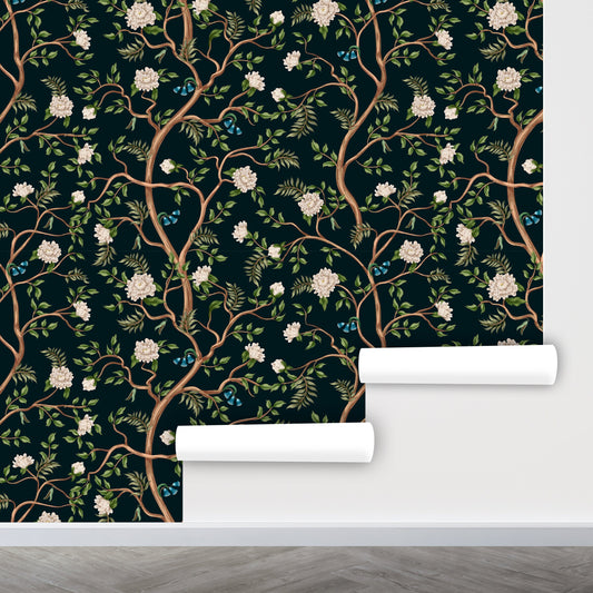 Chinoiserie Wallpaper Peel and Stick, Dark Floral Wallpaper, Garden Wallpaper, Japanese Wallpaper, Removable Wall Paper