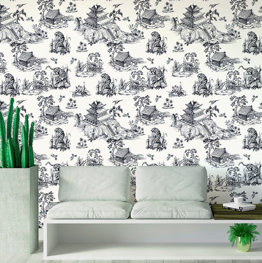 Chinoiserie Wallpaper Peel and Stick, Pagoda Wallpaper, Japanese Wallpaper Black and White, Tiger Wallpaper, Removable Wall Paper