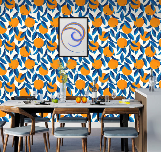 Citrus Wallpaper, Orange Wallpaper Peel and Stick, Fruit Wallpaper, Blue Leaves Wallpaper, Removable Wall Paper