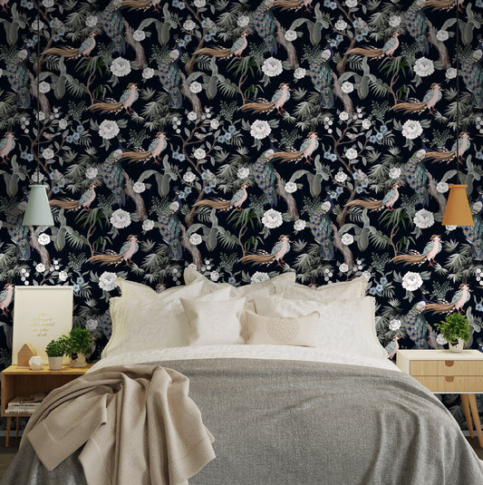 Chinoiserie Wallpaper Peel and Stick, Dark Floral Wallpaper, Garden Wallpaper, Peacock Wallpaper, Removable Wall Paper