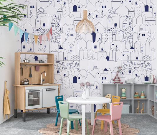 City Wallpaper Peel and Stick, Hand Drawn Wallpaper, Blue White Wallpaper, Removable Wall Paper