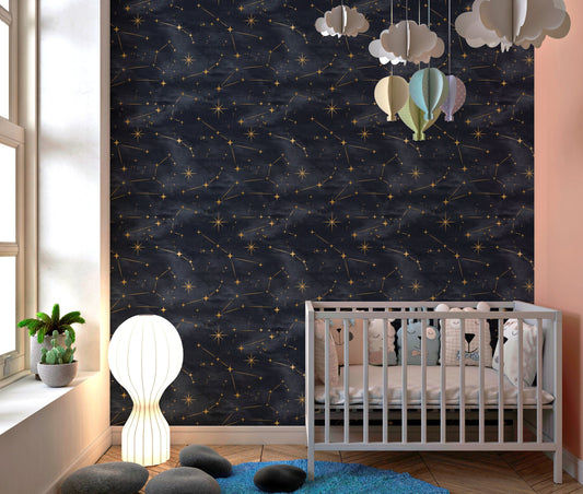 Constellation Wallpaper, Night sky Wallpaper Peel and Stick, Nursery Wallpaper, Black and Gold Wallpaper, Removable Wall Paper