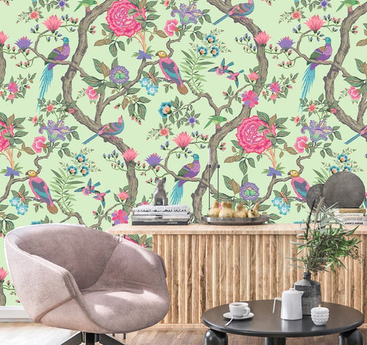 Asian Chinoiserie Wallpaper, Birds in the Garden
