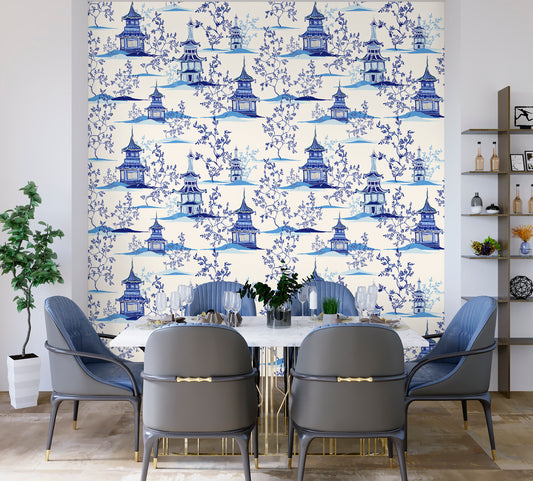Pagoda Wallpaper Peel and Stick, Chinoiserie Wallpaper, Oriental Wallpaper, Removable Wall Paper