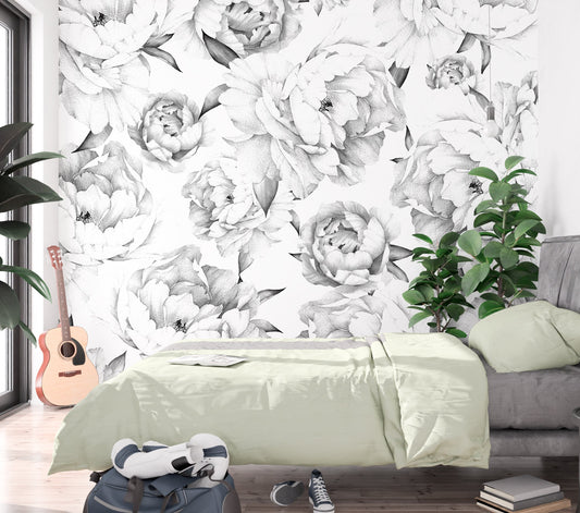 Peony Wallpaper Peel and Stick Mural, Black and White Big Floral Canvas Removable Wall Paper