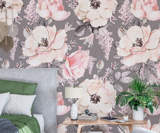Pink Roses Wallpaper Peel and Stick, Big Flowers on Gray Canvas Removable Wall Paper
