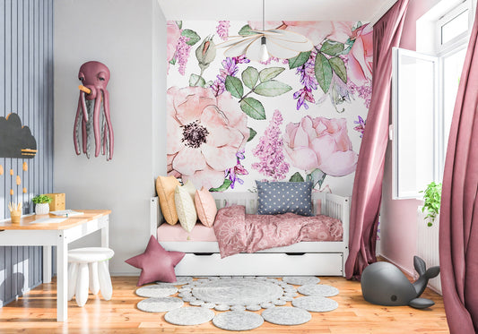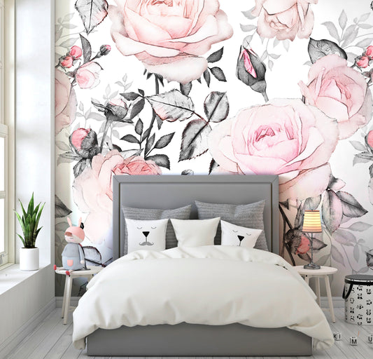 Pink Roses Wallpaper Peel and Stick, Big Flower Wallpaper, Nursery Wallpaper, Removable Wall Paper