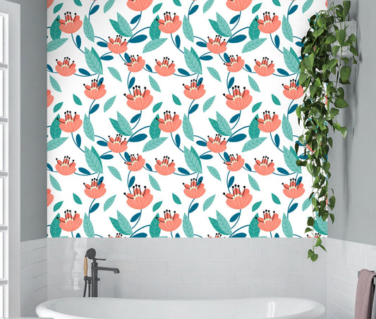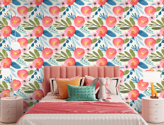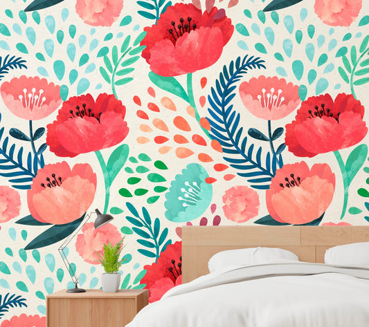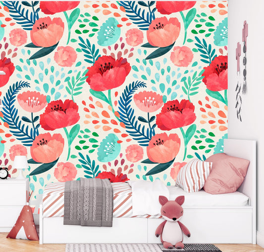 Red Flower Wallpaper Peel and Stick, Blooms Wallpaper, Nursery Wallpaper, Watercolor Wallpaper, Removable Wall Paper