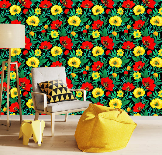 Red Flower Wallpaper Peel and Stick, Colorful Wallpaper, Yellow Wallpaper, Dark Floral Wallpaper, Removable Wall Paper