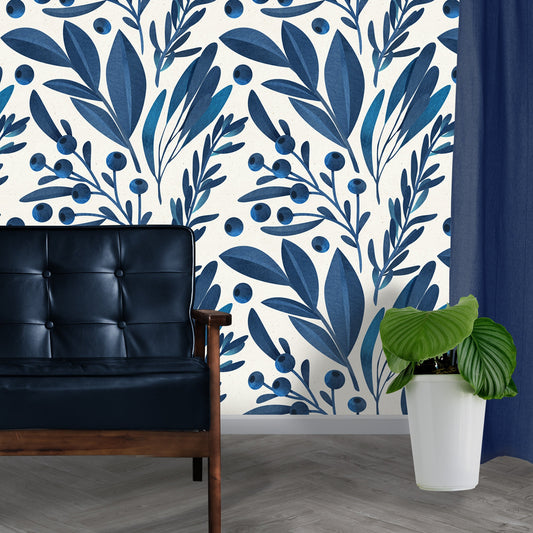Removable Wallpaper Peel and Stick Wallpaper Mural Blue Leaves Wall Paper