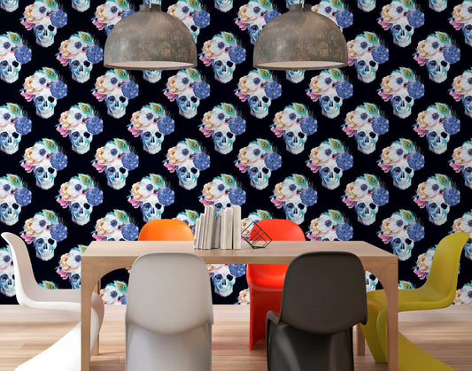 Scull Wallpaper Peel and Stick, Colorful Wallpaper, Dark Floral Wallpaper, Removable Wall Paper