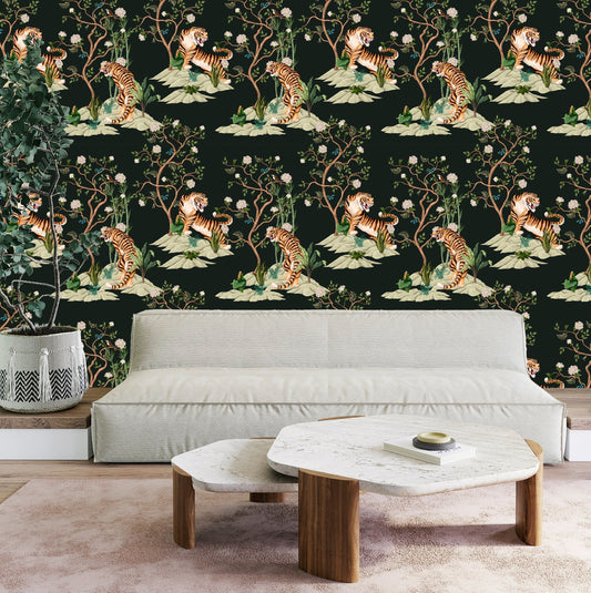 Tiger Wallpaper Peel and Stick, Chinoiserie Wallpaper, Moody Wallpaper, Removable Wall Paper