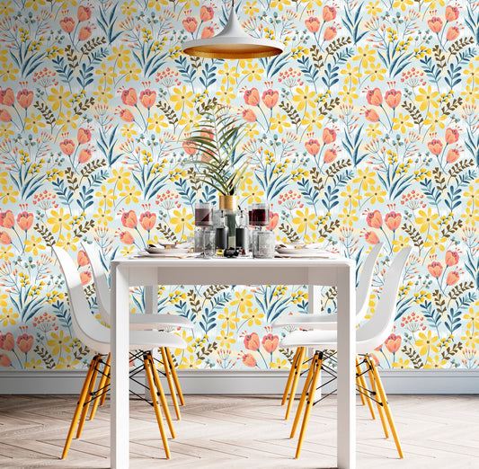 Tulip Wallpaper Peel and Stick, Yellow Floral Wallpaper, Wildflower Wallpaper, Removable Wall Paper