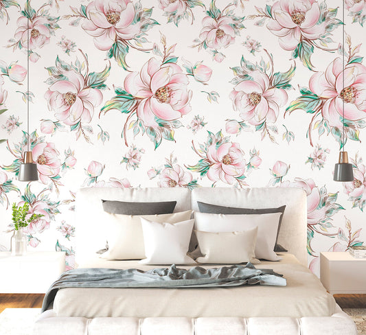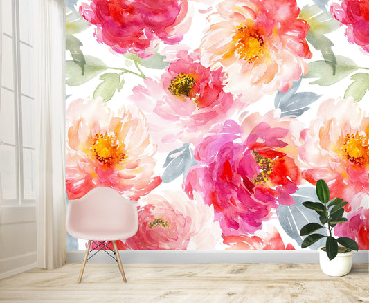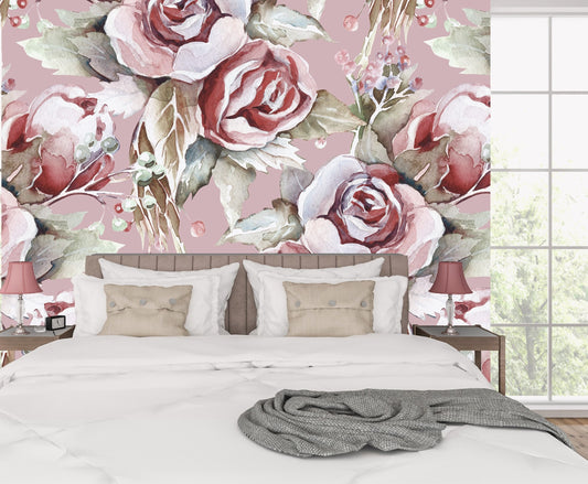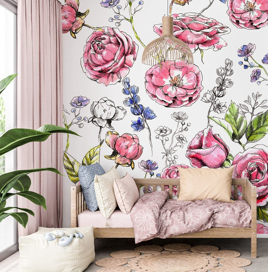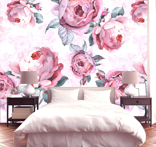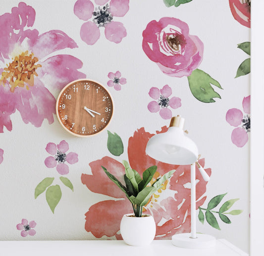 Big Flower Wallpaper Peel and Stick, Pink Roses Wallpaper, Watercolor Flowers Wallpaper, Nursery Wallpaper, Removable Wall Paper