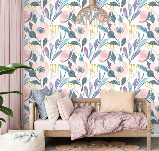 Big Flower Wallpaper Peel and Stick, Watercolor Flowers Wallpaper, Nursery Wallpaper, Removable Wall Paper