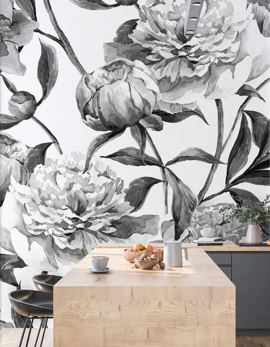 Big Flowers Wallpaper Peel and Stick Black and White, Peony Wallpaper, Hand Drawn Wallpaper, Removable Wall Paper