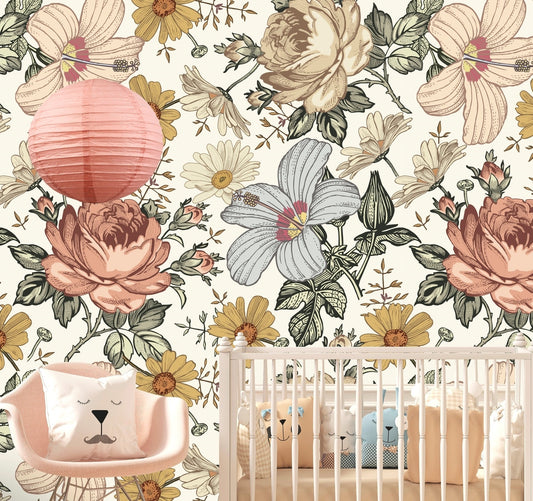 Big Flower Wallpaper Peel and Stick, Vintage Floral Wallpaper Nursery Wallpaper, Removable Wall Paper