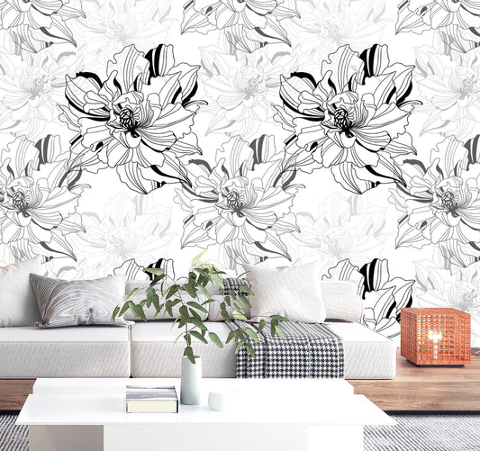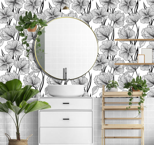 Black and White Peony Wallpaper Peel and Stick, Big Flower Wallpaper, Removable Wall Paper