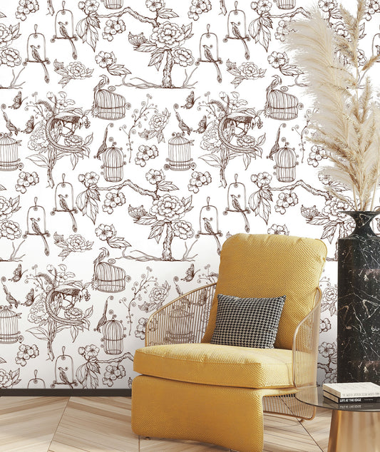 Bird Cage Wallpaper, Asian Wallpaper Peel and Stick, Hand Drawn Wallpaper, Removable Wall Paper