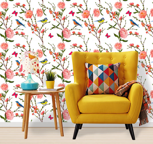 Birds and Butterfly Wallpaper Peel and Stick, Sakura Wallpaper, Branches Wallpaper, Pink Floral Wallpaper, Removable Wall Paper