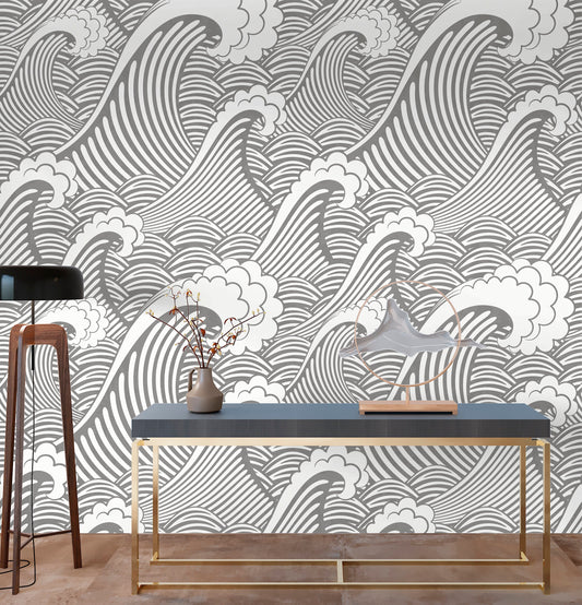 Big Wave Wallpaper Peel and Stick, Nautical Wallpaper, Gray White Wallpaper, Removable Wall Paper