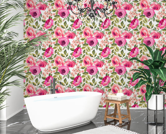 Bright Pink Floral Wallpaper Peel and Stick, Roses Canvas Removable Wall Paper
