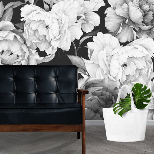 Dark Floral Wallpaper Peel and Stick, Watercolor Peony Wallpaper, Black and White Wallpaper, Removable Wall paper
