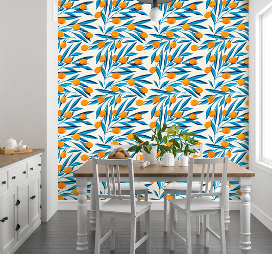 Citrus Wallpaper, Blue Leaf Wallpaper Peel and Stick, Tropical Wallpaper, Lemon Wallpaper, Removable Wall Paper