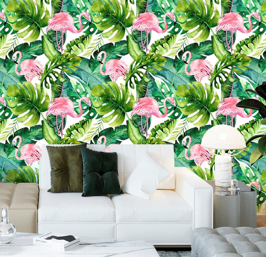 Flamingo Wallpaper Peel and Stick, Palm Wallpaper, Tropical Wallpaper, Removable Wall Paper