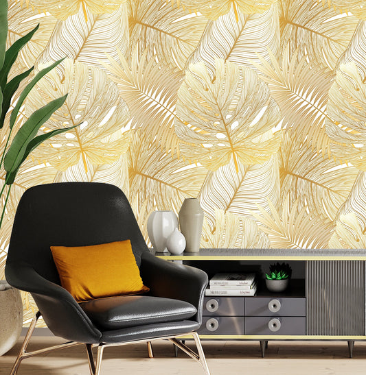 Gold Leaf Wallpaper Peel and Stick, Palm Leaf Wallpaper, Yellow Wallpaper, Self Adhesive Wallpaper, Removable Wall Paper