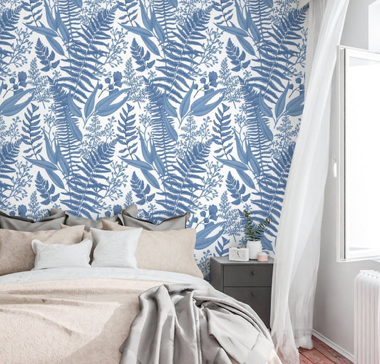 Blue Leaf Wallpaper Peel and Stick, Fern Wallpaper, Tropical Leaves Wallpaper, Removable Wall Paper