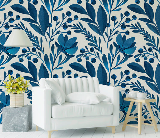 Blue Leaf Wallpaper, Blue Floral Wallpaper Peel and Stick, Tropical Leaves Wallpaper, Nursery Wallpaper, Removable Wall Paper