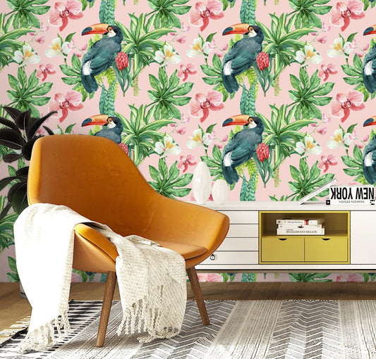 Parrot Wallpaper, Tropical Wallpaper Peel and Stick, Orchid Wallpaper, Green Leaf Wallpaper, Removable Wall Paper