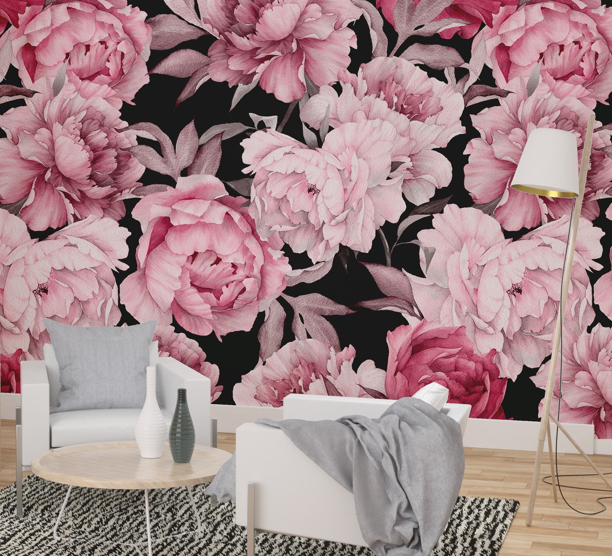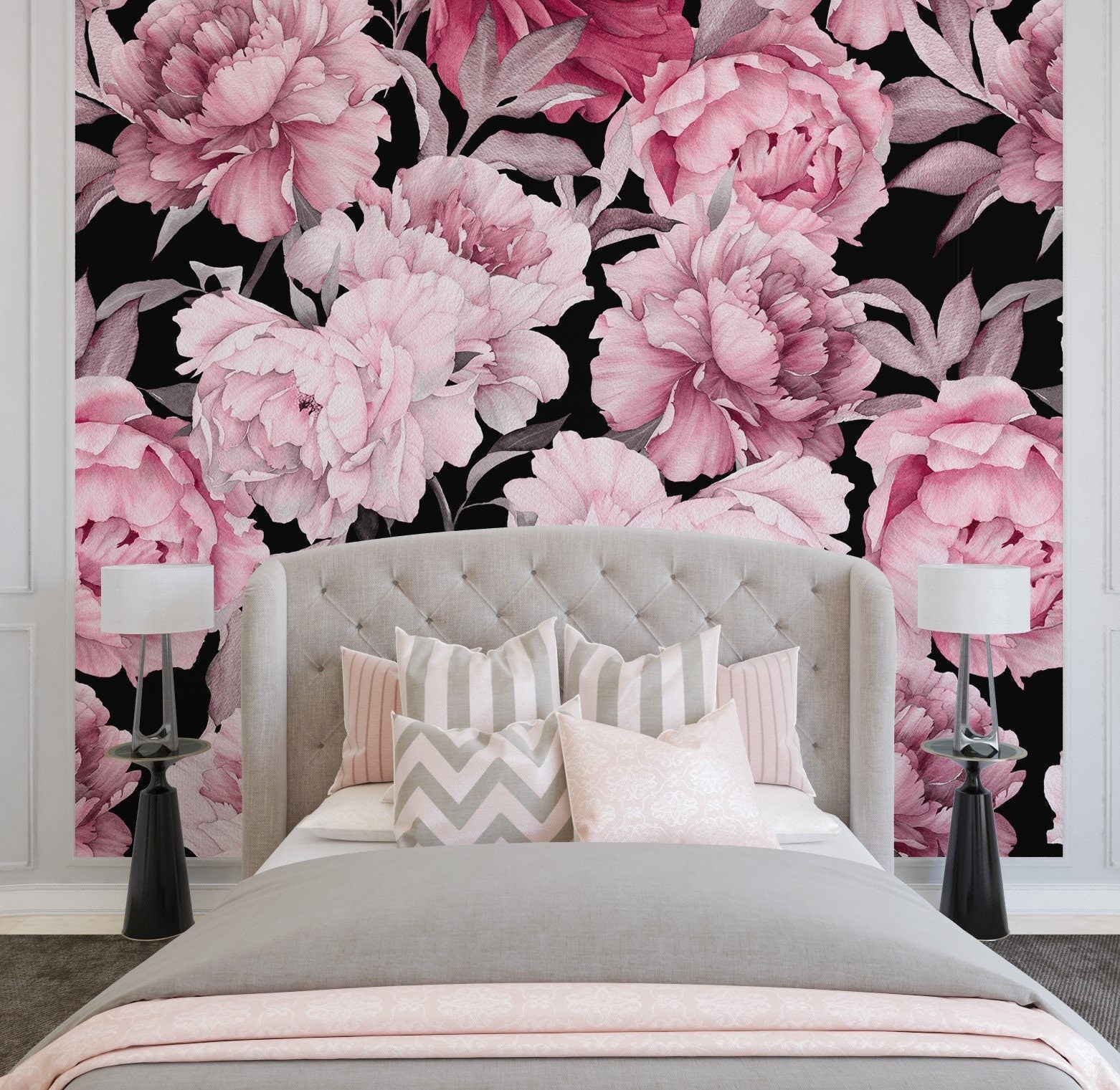 Dark Floral Wallpaper Peel and Stick, Pink Peony Wallpaper, Blossom Wallpaper, Removable Wall Paper
