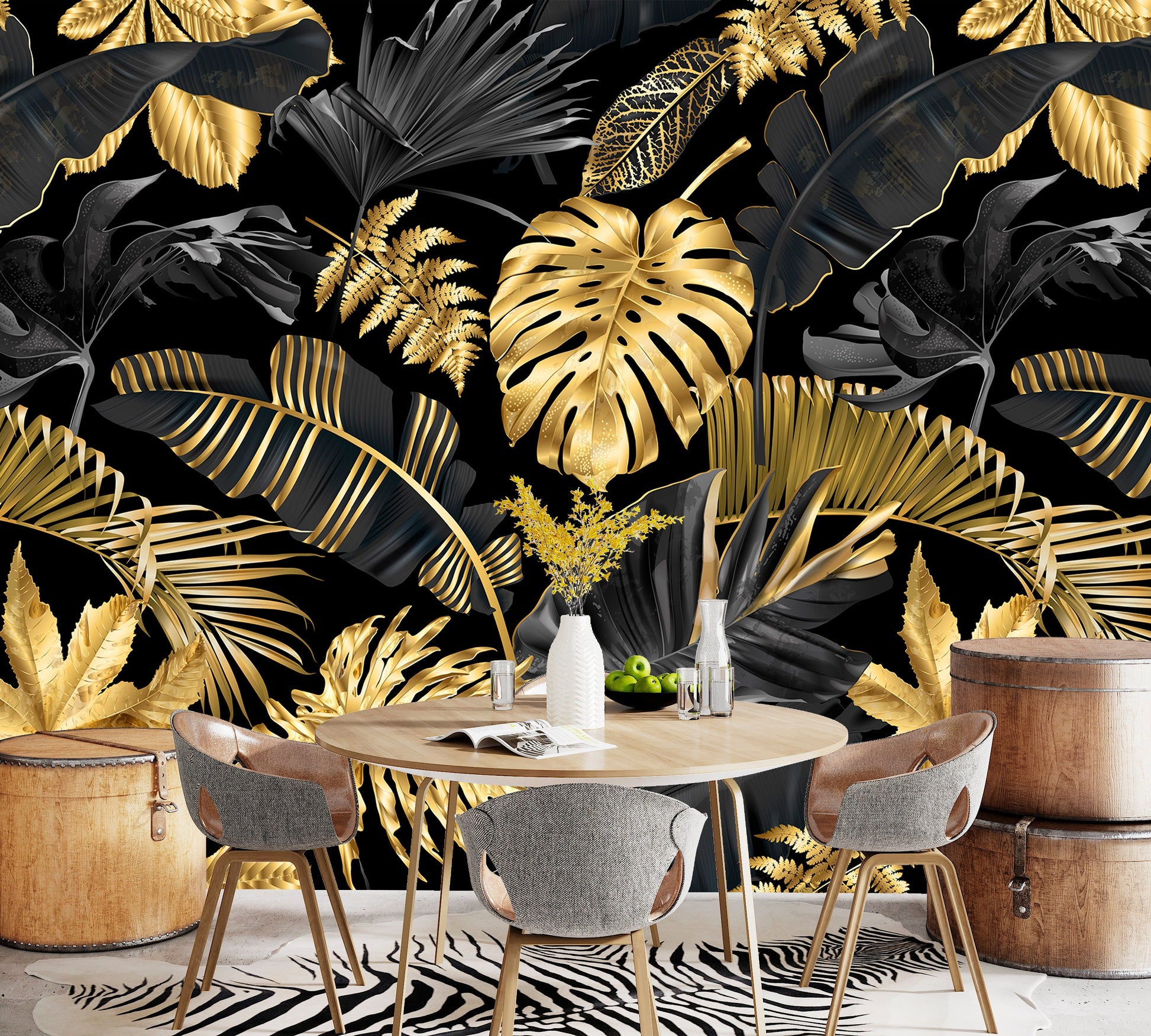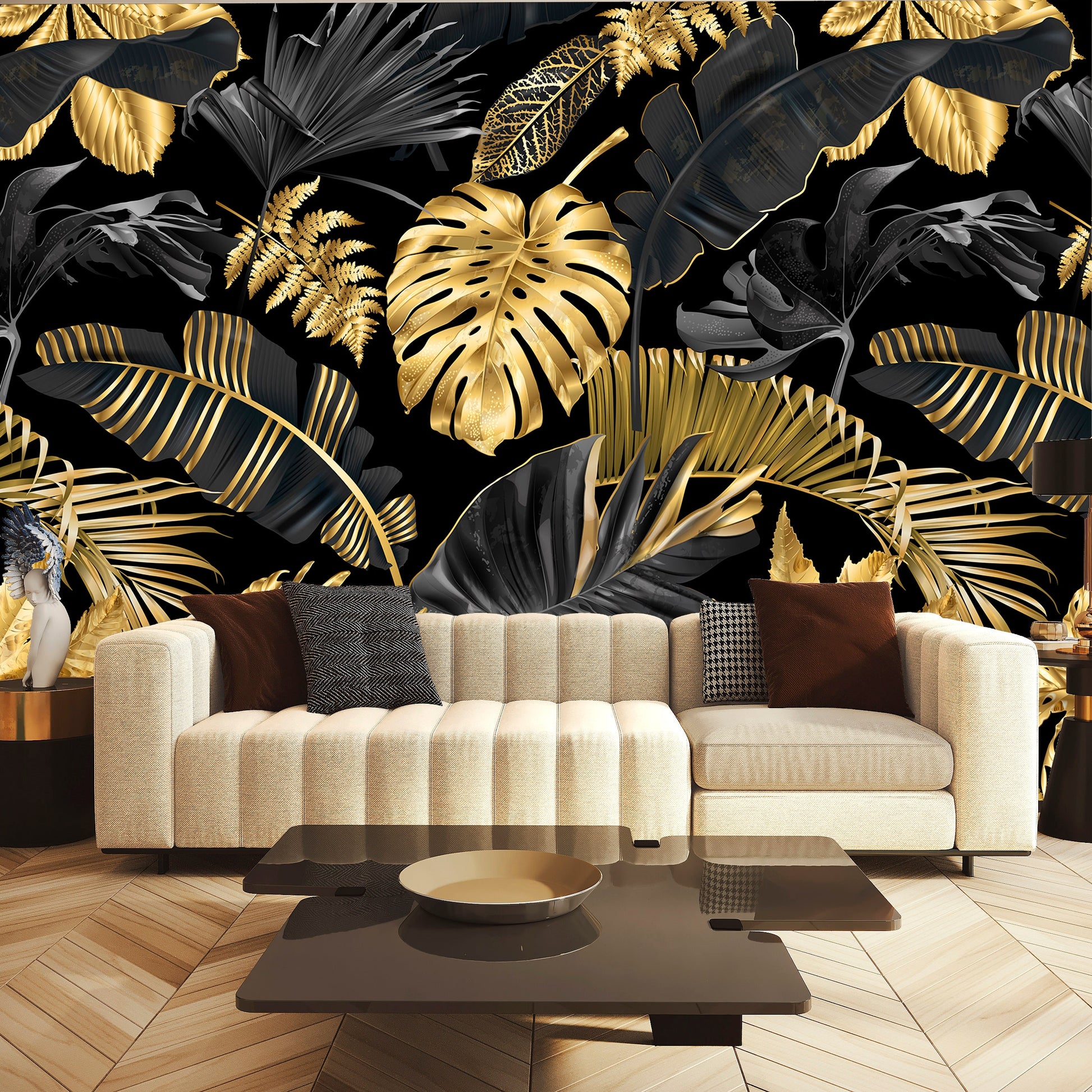 Gold Leaf Wallpaper Peel and Stick, Black and Gold Wallpaper, Palm Leaf Wallpaper, Removable Wall Paper