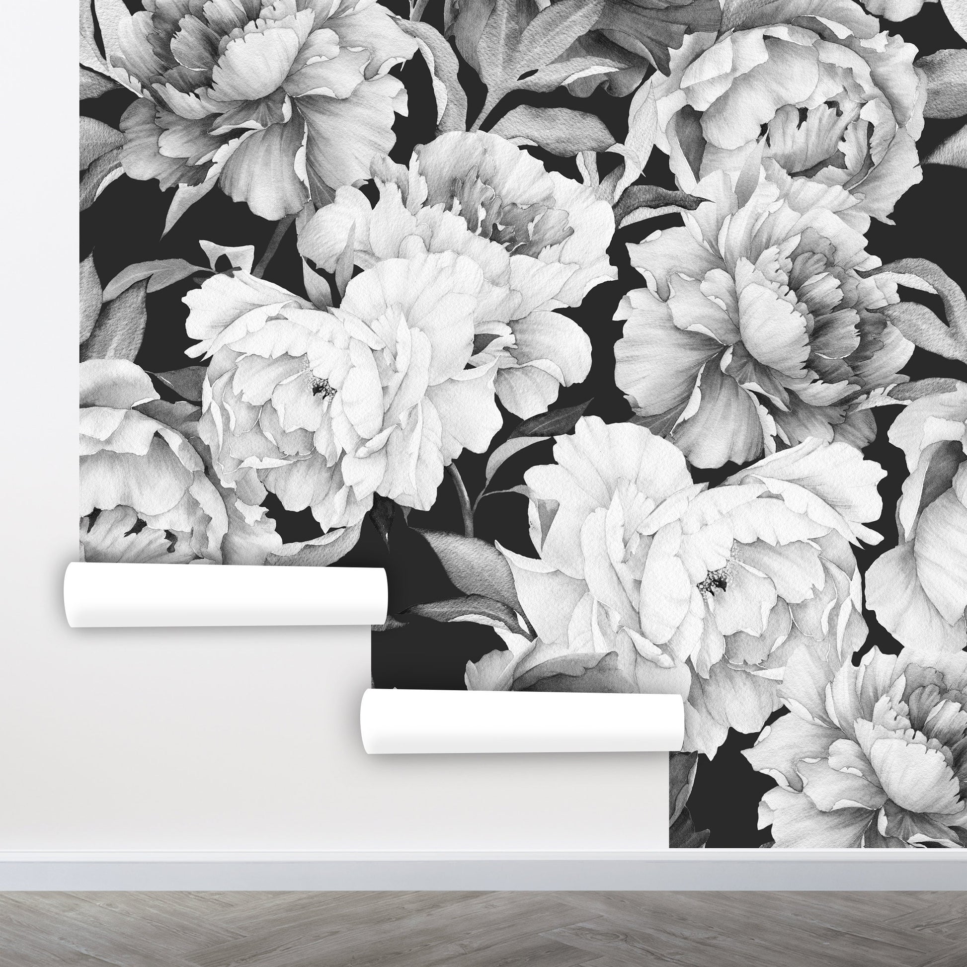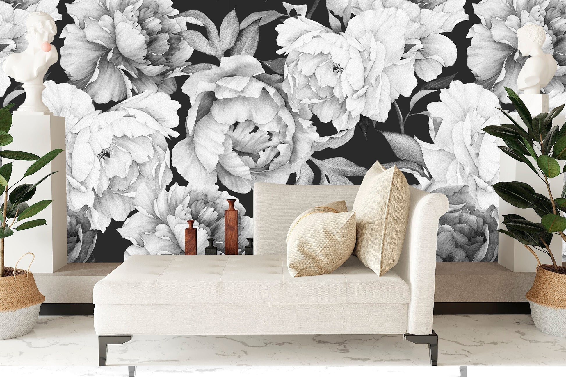Peony Wallpaper, Big Flower Wallpaper Peel and Stick, Black and White Wallpaper, Watercolor Floral Wallpaper, Removable Wall Paper