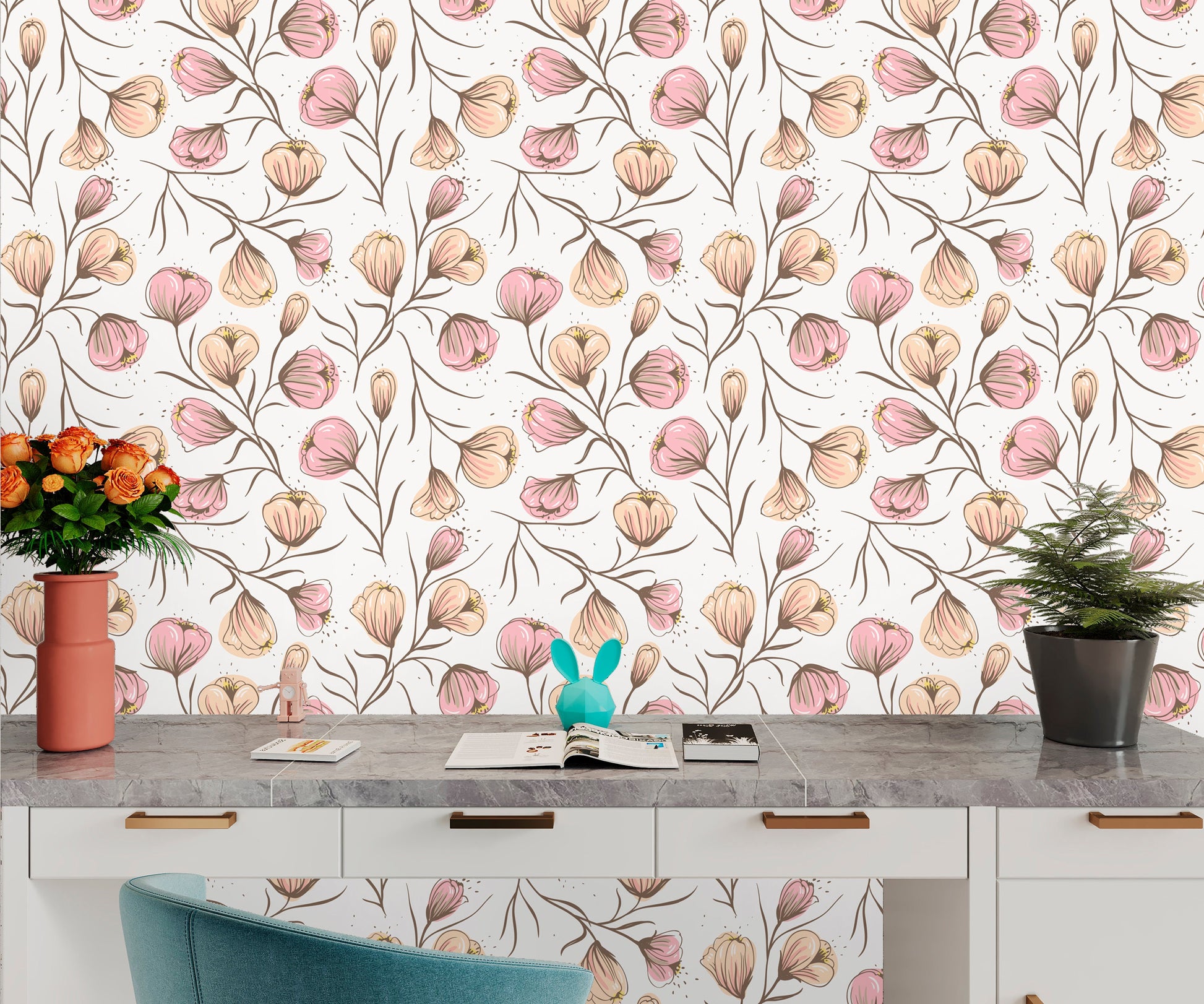 Pink Floral Wallpaper Peel and Stick, Spring Wallpaper, Farmhouse Wallpaper, Nursery Wallpaper, Removable Wall Paper