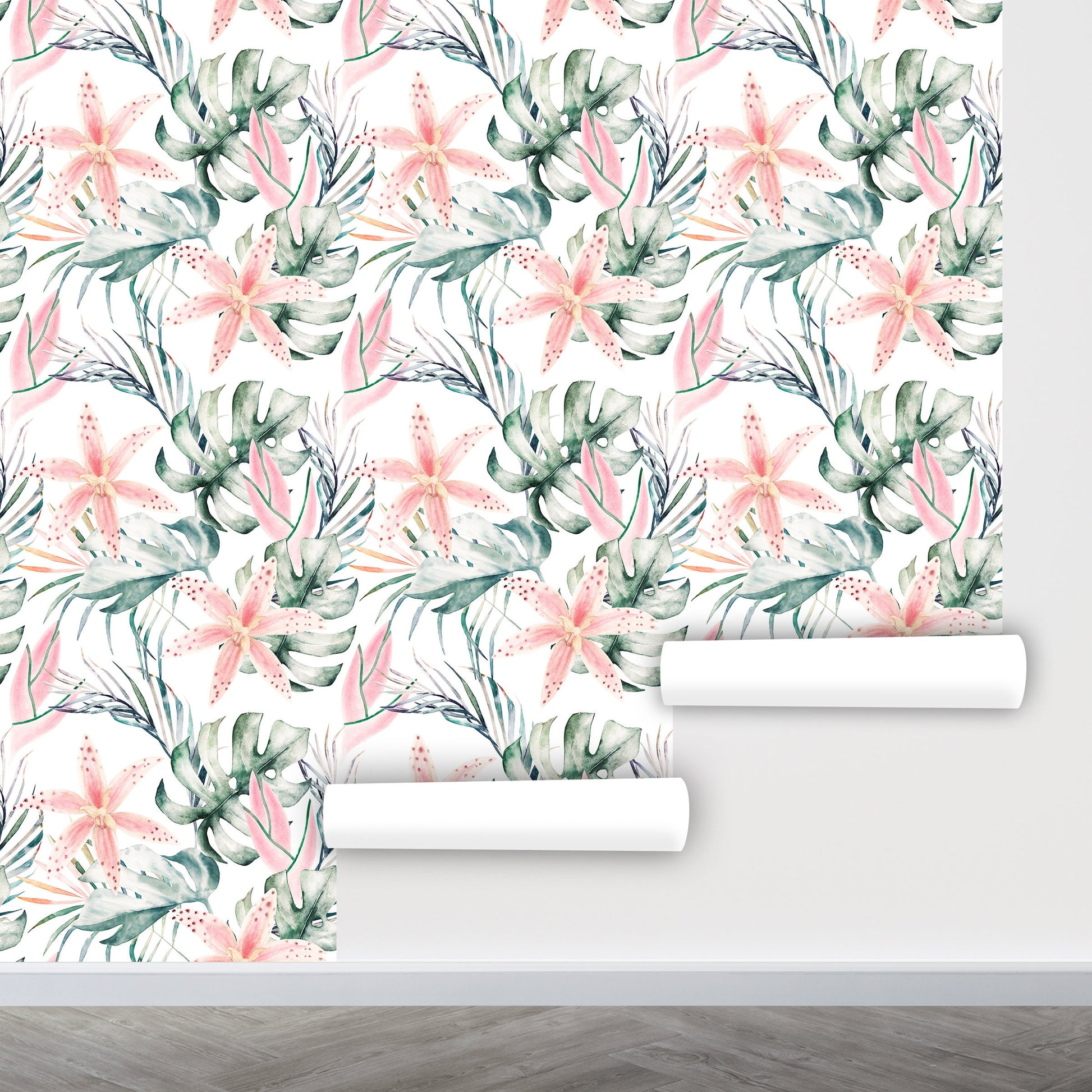 Soft Palm Wallpaper Peel and Stick, Watercolor Wallpaper, Blush Flowers Wallpaper, Tropical Wallpaper, Removable Wall Paper